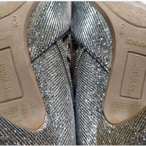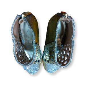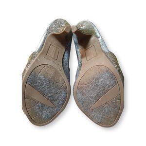Caged Glitter Heeled Booties, Peep Toe. Gold & Silver Iridescent High Glitter Effect. Rubber Soles With A Textured No Slip Bottom, Gold Zipper Back Closures. Padded Insoles for Comfort. Worn Twice, Excellent Condition, Some Very Minor Wear On The Sole To The Textured Sole, Please Refer To Pictures. These Are Very Glittery, With Both Gold And Silver As The Light Moves Across Them, Very Pretty Effect.