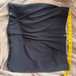 adorable and flattering black mini with a glittery sequin hemline and a slit on one thigh