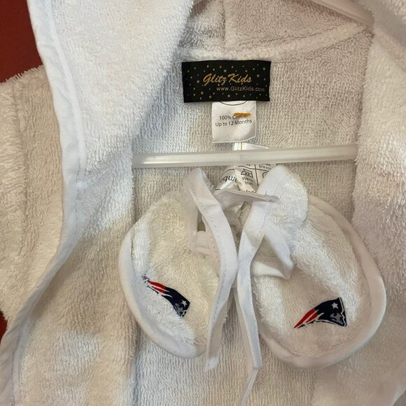 Glitz Kids Baby New England Patriots Bathrobe & Slipper Set - 0-12M - Great preowned condition! 100% cotton. Tie on matching booties with terry cloth bathrobe.