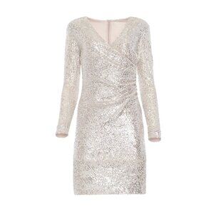 This stunning plus-size Joseph Ribkoff dress will light up any occasion with its all-over sparkle of silver sequins. Designed in a fitted style with long sleeves, a cross-over V-neckline and ruching to the side for a truly flattering look. The dress is fully lined and has a concealed zip fastener at the back.