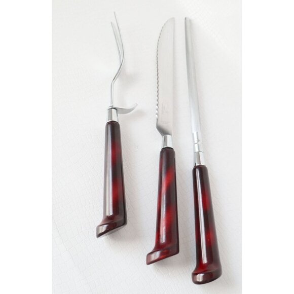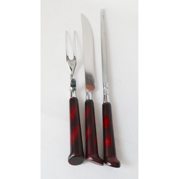 Red bakelite handles on this Canadian made Glo-Hill Cutlery 3 piece meat carving set.