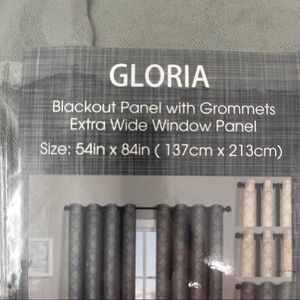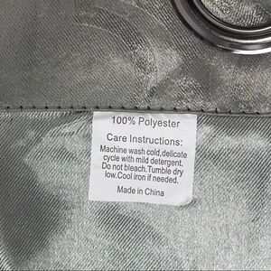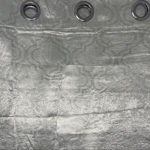 Set of 2 Blackout Panels, Light Grey with Design and Metal Grommets. One curtain has been opened and has no package, and the other is NEW in package. Called Light Grey, but to me it is more of a Gunmetal Grey, with a bit of sheen. Blocks out over 98% of light and reduces outside noise. 100% Polyester, machine wash cold.