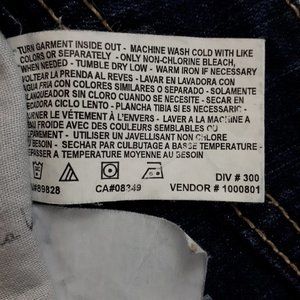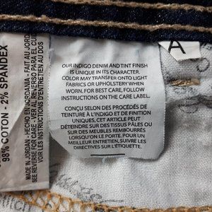 High-rise jeans in a dark wash blue shade. Made with comfortable stretch material from a cotton blend. It’s designed in a straight-leg cut with contrast stitch detailing and has signature metal rivets. Complete with a zipper and button closure, 5 pockets, including back flap pockets secured with a button. Great condition.