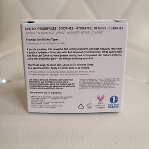 A purple paradise, this powerful fast-acting AHA/BHA gel mask naturally resurfaces + cools + firms skin with Red Seaweed, Fruit Enzymes, White Willow Bark and Aloe Leaf Juice to reveal greater clarity, look of improved skin texture and tone, and a more youthful glow — all without irritating your skin.