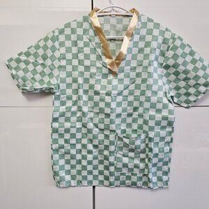 This gorgeous two-piece set is perfect for bringing a touch of zen into your everyday routine. The lightweight fabric, adorned with a serene green-and-white checkered pattern, feels effortlessly calming, while the soft gold neckline adds a subtle touch of elegance. It's like stepping into a luxurious spa every time you put it on. Whether you’re relaxing with a good book or enjoying a quiet evening, this set is designed to envelop you in comfort and tranquility. A must-have for anyone who craves that peaceful, spa-like vibe at home!
