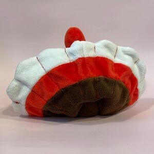 Gobbles is a brown turkey with a redhead and red wingtips. She has black button eyes, a yellow beak with black stitching for her nostrils and a red wattle under her chin. She has bright yellow feet and a brown, red and white fantail.