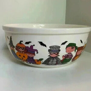 Goblins by Ursula Dodge stoneware trick or treat candy bowl. This bowl has wonderful vintage graphics inside and out. It is in excellent preowned condition with no chips, cracks or damage to the paint. The finish is shiny and free of scratches.