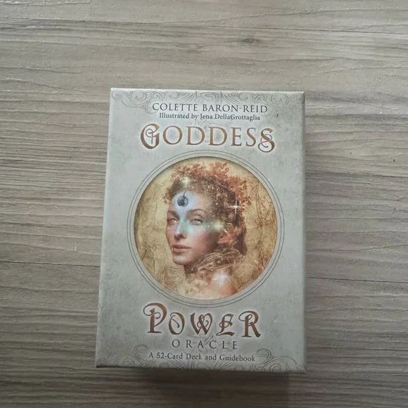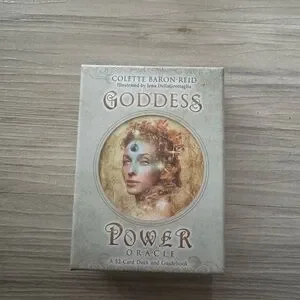 Goddess Power Oracle deck in cream. Includes 52 oracle cards and guidebook. Beautifully illustrated for intuitive readings and spiritual guidance. Portable and elegant; ideal for personal practice or gifts.