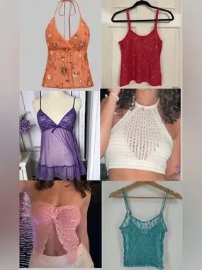 Collection of women’s sleeveless tops and camisoles in multiple colors. Features include lace, crochet, sheer and knit styles. Soft purple lace babydoll, white crochet halter, pink strapless cami, orange floral camisole, red sequin tank, and teal lace cami included. Lightweight, feminine pieces ideal for a fun summer closet!!