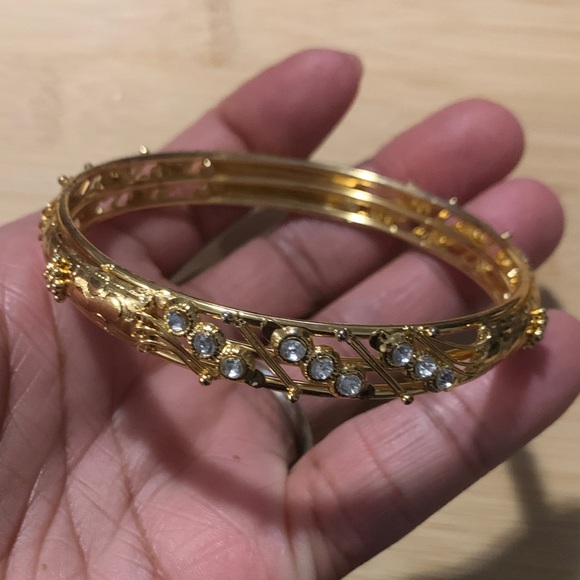 This stunning gold bangle features intricate sparkly clear rhinestones. perfect for adding a touch of elegance to any outfit. Ideal for both casual and formal occasions.