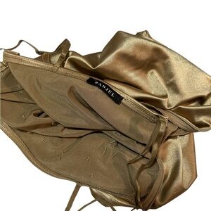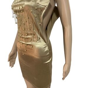 Elegant gold mini dress with intricate bead detailing. Perfect for special occasions.