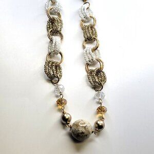 Long Statement Necklace with Large Round Beads interspersed with rings of mini gold beads and rings of mini white faux pearls