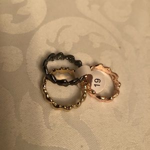 Super cute and on trend! Dainty rings that can be worn all together or individually. Individually they fit a size 10. If all three worn together go down one size to 9. Labelled size 19 Gold ring has pave set crystal heart These are fashion rings and are not meant to be worn on a daily basis.