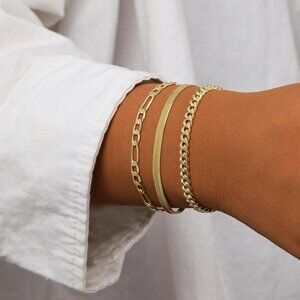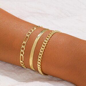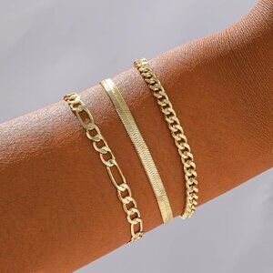 3 Pcs GOLD BRACELETS SET:These gold stackable bracelets for women consists of 3 style chain bracelets. Set contains: Figaro Link Bracelets, Snake Link Bracelets, Cuban Link Bracelets. Each dainty bracelet can be worn separately and you can also wear several chains at the same time, creating various styles and highlighting fashion and elegance