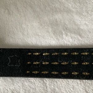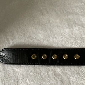 This sophisticated black leather belt is accentuated with a striking gold buckle, making it a perfect accessory for formal occasions. Crafted from high-quality leather, it features a smooth texture and clean stitching, ensuring durability and style.some wear on gold
