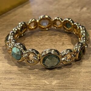 Stylish gold chain link set featuring vibrant blue and green gemstones. Ideal for any occasion. Bracelet slips on, elastic stretch band.