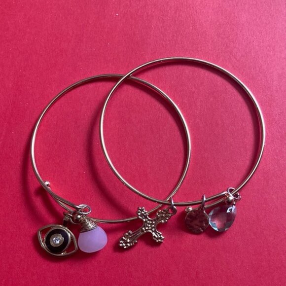 Elegant gold bangle set featuring unique charms. Perfect for adding a touch of sophistication to any outfit.