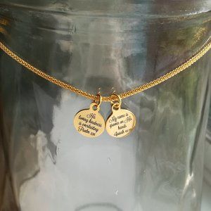 A gold plated stainless steel necklace with two laser engraved gold plated stainless steel scripture charms. 18" long.