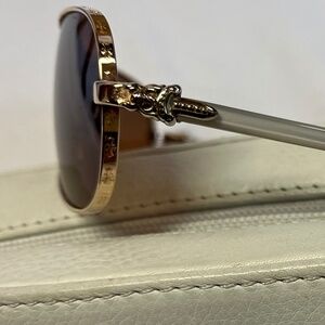 These are the gold "RED" Chrome Hearts aviators with Mother of Pearl arms. You will find the daggers at the temples and etched crosses around the rims. These are small sunglasses and measure about 5 1/2 inches across. Nobody makes cooler sunglasses than Chrome Hearts!!