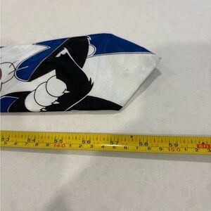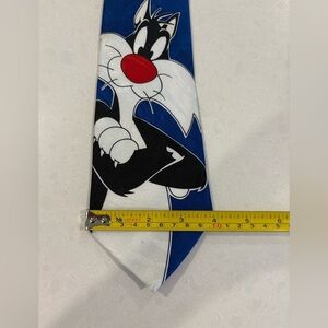 Vibrant royal blue tie featuring Sylvester the Cat. Crafted by Gold City, this 100% silk tie is handmade and showcases a rich jacquard pattern behind the playful character print. A unique piece for Looney Tunes fans or collectors of novelty fashion.