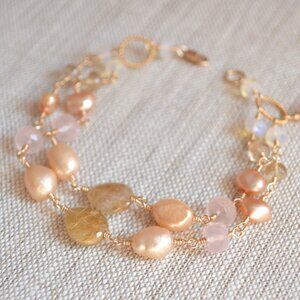 This gold wedding bracelet is luxuriously feminine. I designed this piece with Spring brides in mind, but it is perfect for anyone who covets these soft, subtle colours. Two strands of gemstones and pearls encircle your wrist in this lovely bracelet, which combines pale gold, blush pink, champagne and peach shades. I used golden rutilated quartz, rose quartz, ametrine, opals and freshwater pearls in this piece. A smooth, pear-shaped rose quartz stone decorates the clasp. This is the perfect touch for an elegant Spring wedding, or just as a special splurge for you!
