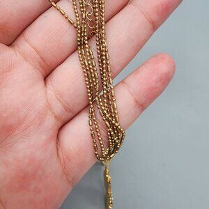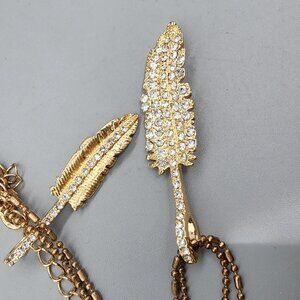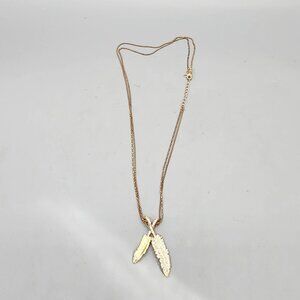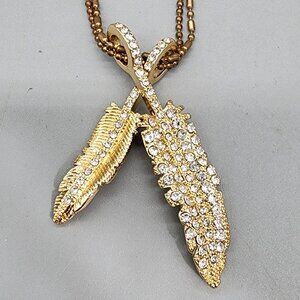 Gold Feather Pendant Necklace w/ Rhinestones Double Chain Boho Chic 18"