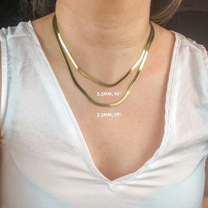 Herringbone chain plated in 14k gold offers a modern necklace look. Necklace has a lobster clasp and has a high polished finish that gives it a shiny look.