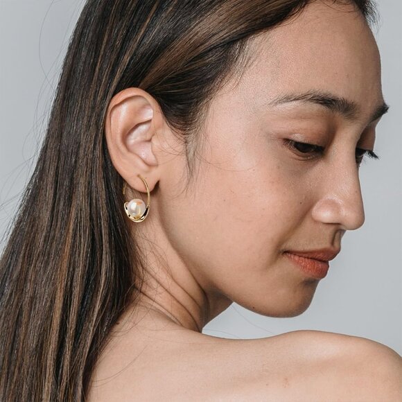 These half hoop C shaped earrings feature a gold curve bar that beautifully frames a resin round faux pearl. The lustrous pearl resembles a full moon rising upon a tranquil pool, creating a scene of serene beauty and sophistication.