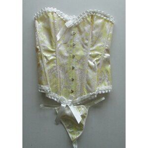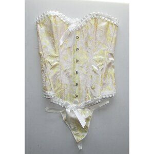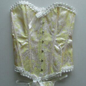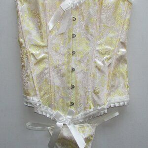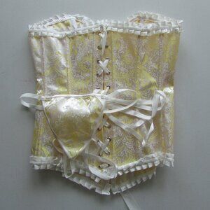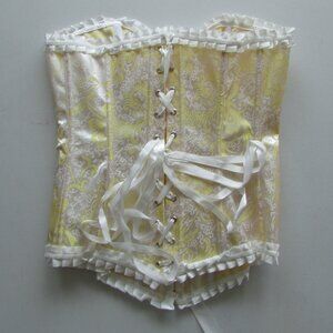 Creamy off white and gold jacquard boned corset with ruffled tops and bottoms