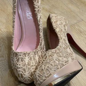 Great blend of materials: beige cloth, gold glitter, gold metalling edge on toe