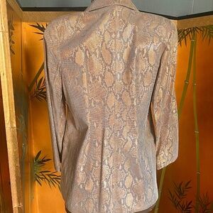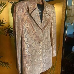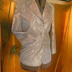 Pristine / new without tags stunning gold leather suit with snakeskin design in a standard size 12. No signs of wear. Comes with matching skirt.