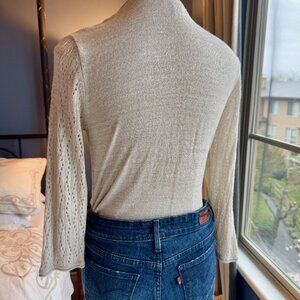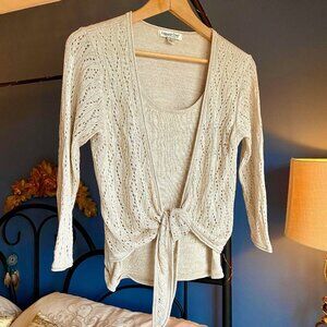 Light shimmery gold coloured sweater with open knit long sleeve tie up top and attached solid tank from mid 00s. Coldwater Creek size M. Bust measures 17 inches laying flat, length from shoulder to hem is 21 inches. Excellent used condition. Cat friendly, nonsmoking home.