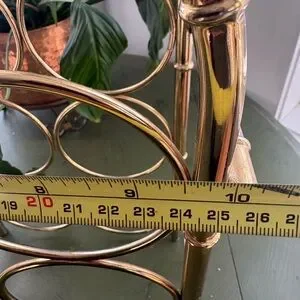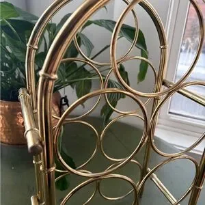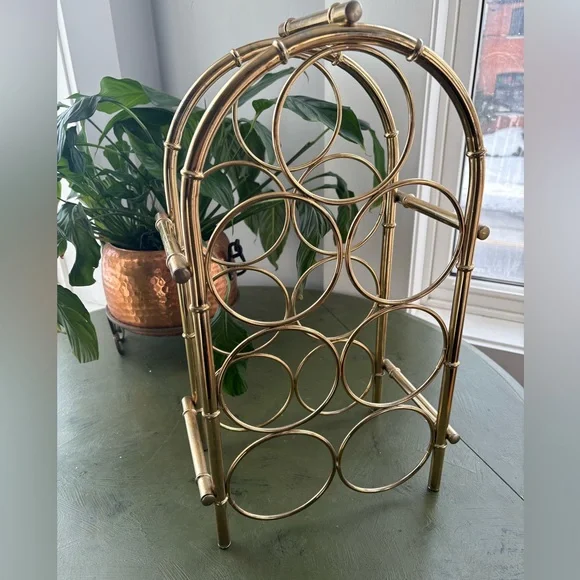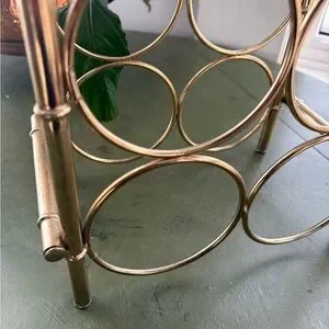 Elegant gold metal wine rack with circular design. Perfect for home decor.