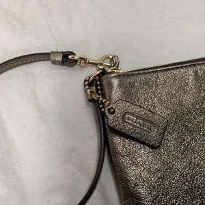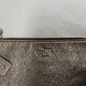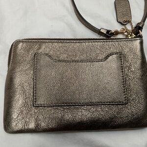 This wristlet looks like it has never been used. There is no visible wear on the outside; the inside is clean. It still has the hang tag, and it has some pockets: one on the back for ID, and two card slots on the inside.