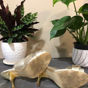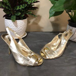 Gold Peep Toe Pumps with Buckle and Metal Heel, slightly worn. Purchased in Australia, size 38 (7 1/2). Brand is UNNIU.