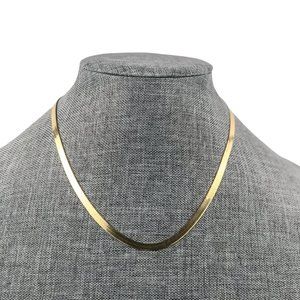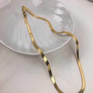 A Herringbone chain plated in 14k gold offers a modern necklace look. Necklace has a lobster clasp and has a high polished finish that gives it a shiny look.