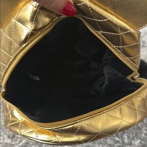 This luxurious mini backpack shines in a metallic gold hue, featuring a quilted design that adds texture and elegance. Its compact shape is enhanced by playful circular ears, making it a standout accessory for any occasion.