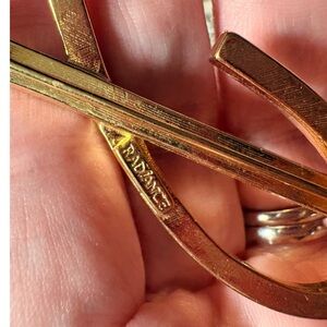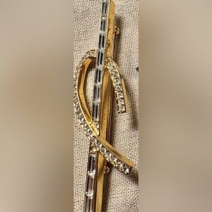 Elegant gold-tone bar brooch with a curved rhinestone accent. Sparkling clear stones set along the design. Classic versatile accessory for jackets or scarves.