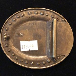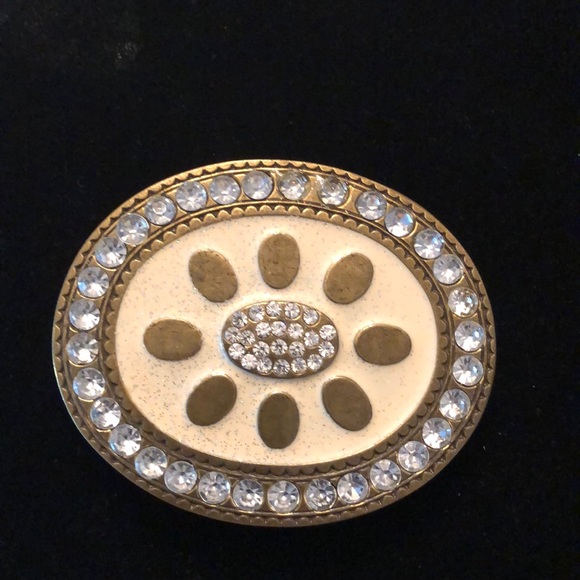 NWT. Full metal belt buckle. White inner circle with gold trim and rhinestones on edges and middle. 3.5” wide and 3” high.