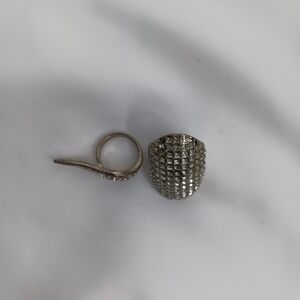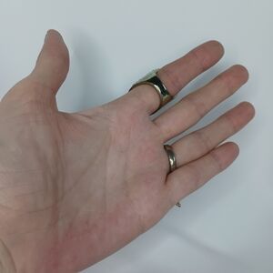 The finish is scratched up on both bands. There is a dark smudge in the middle of the larger ring.