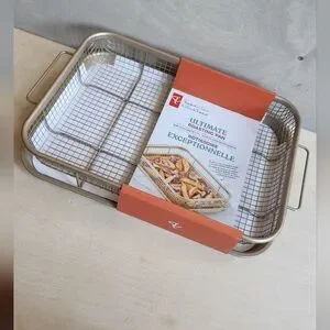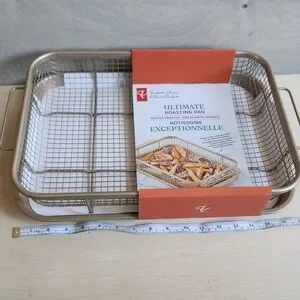 Enhance your cooking with the Gold Roasting Pan. This elegant gold pan comes with a convenient rack, perfect for roasting your favorite dishes to perfection.