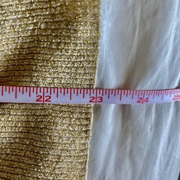 Gold shimmery metallic 33% silk cardigan with built in camisole and gold chain neckline from August Silk, size M. Excellent used condition. Bust measures 16 inches laying flat, length from top to hem is 23 inches. Cat friendly, nonsmoking home.