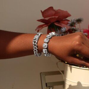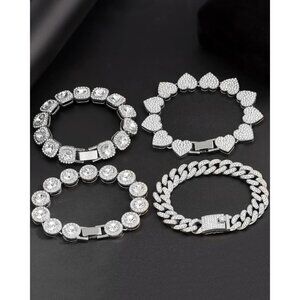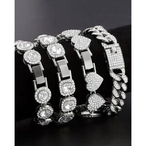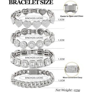 4PCS: This women bracelet set includes four different styles of bracelets: a heart bracelet, a square tennis chain, a round tennis chain, and a Cuban chain bracelet. Each bracelet measures 8 inches long. Wear crystal bracelet alone or layer it with other chains for a layered look.