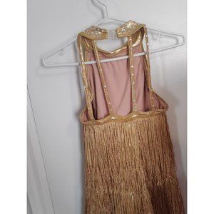 Custom made gold spandex skating dress with full fringe. Great for an interpretive or upbeat solo. Also great for 1920's themed parties!