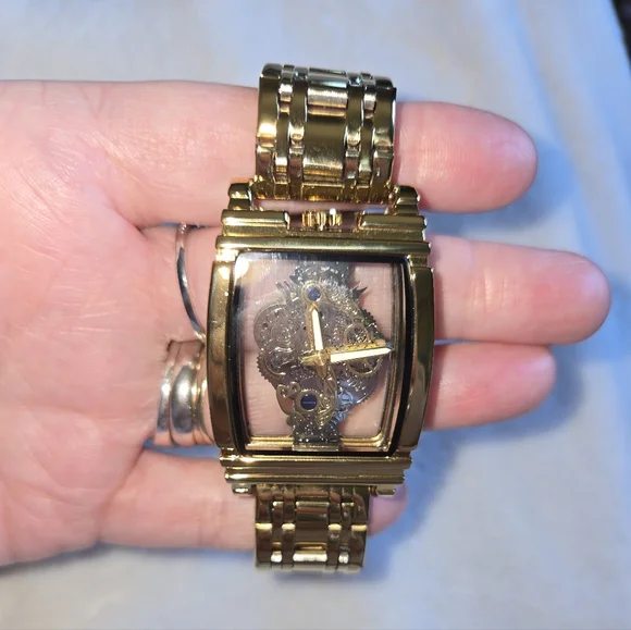 Elegant gold skeleton watch with intricate detailing. Perfect for adding a touch of sophistication to any outfit.
