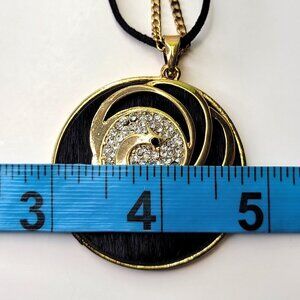 Round Circular Black Pendant on a black cord and gold tone double chain