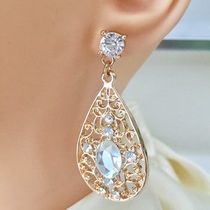Gold Teardrop Antique Detail Rhinestone Earrings - Fashion Jewelry