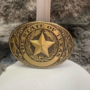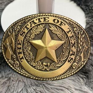 Metal Gold belt buckle featuring 'The State of Texas' design with a star emblem.