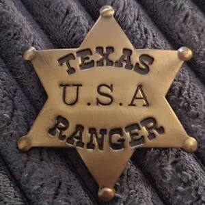 Gold star-shaped badge. Features 'Texas U.S.A Ranger' text. Classic design.