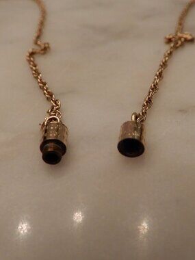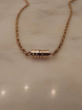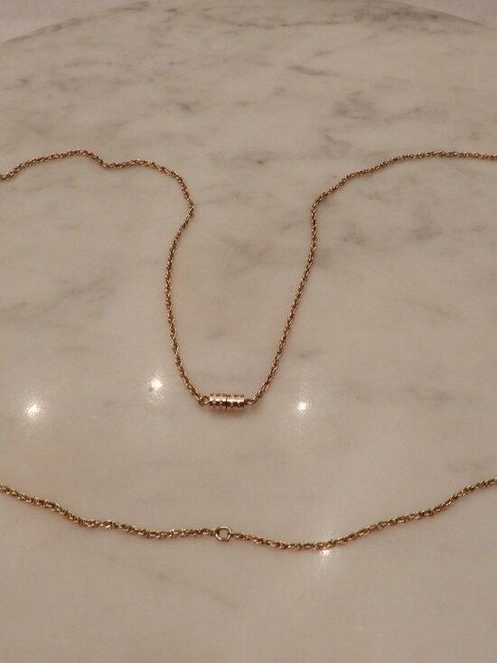 This is a classic gold tone 28 inch chain of about 1 mm diameter. It closes securely with a barrel screw together closure. At the lowest point is a small (approximately 2 mm) ring that charms or a pendant could be attached to. It can also be removed by a jeweler if desired. It is in excellent pre-owned condition.